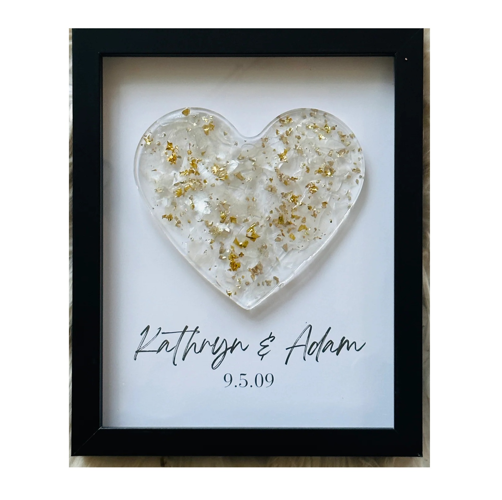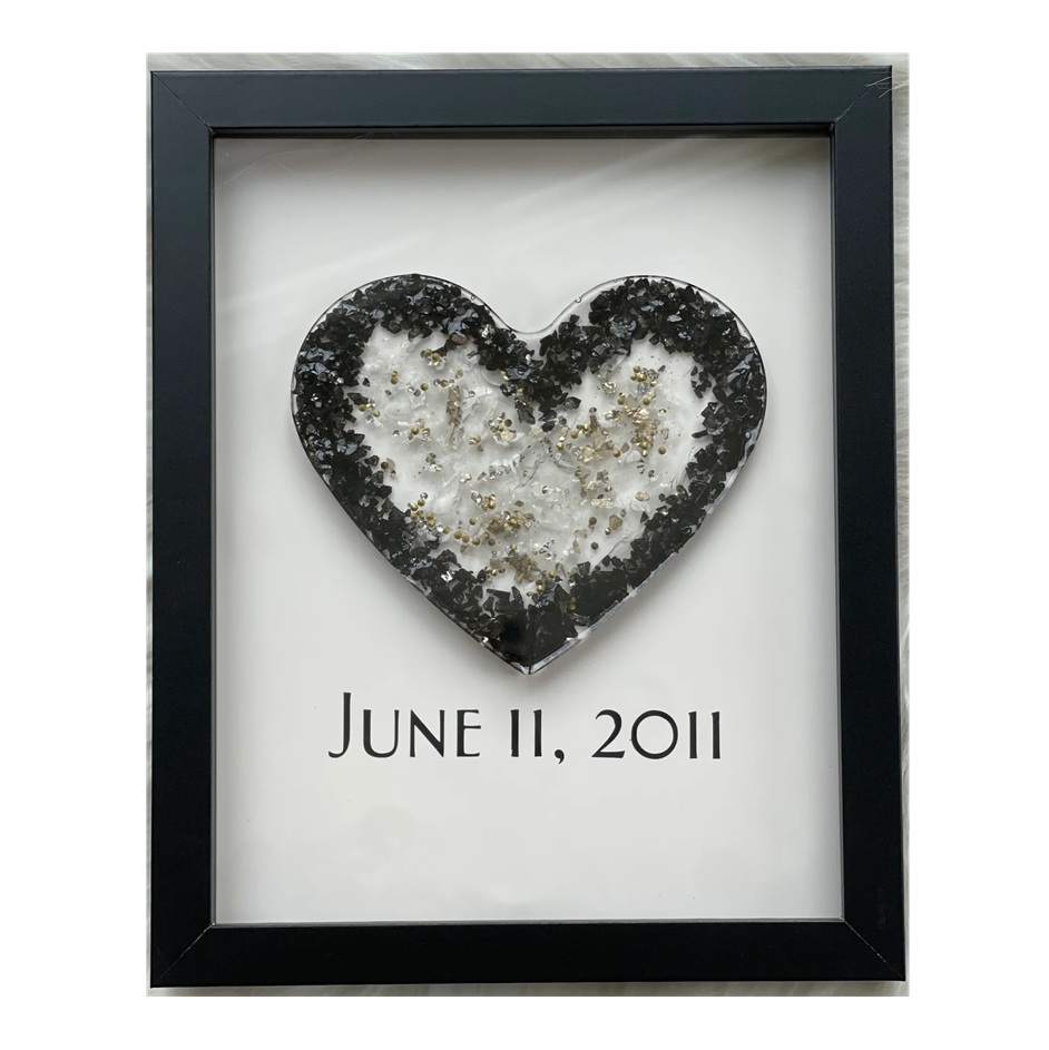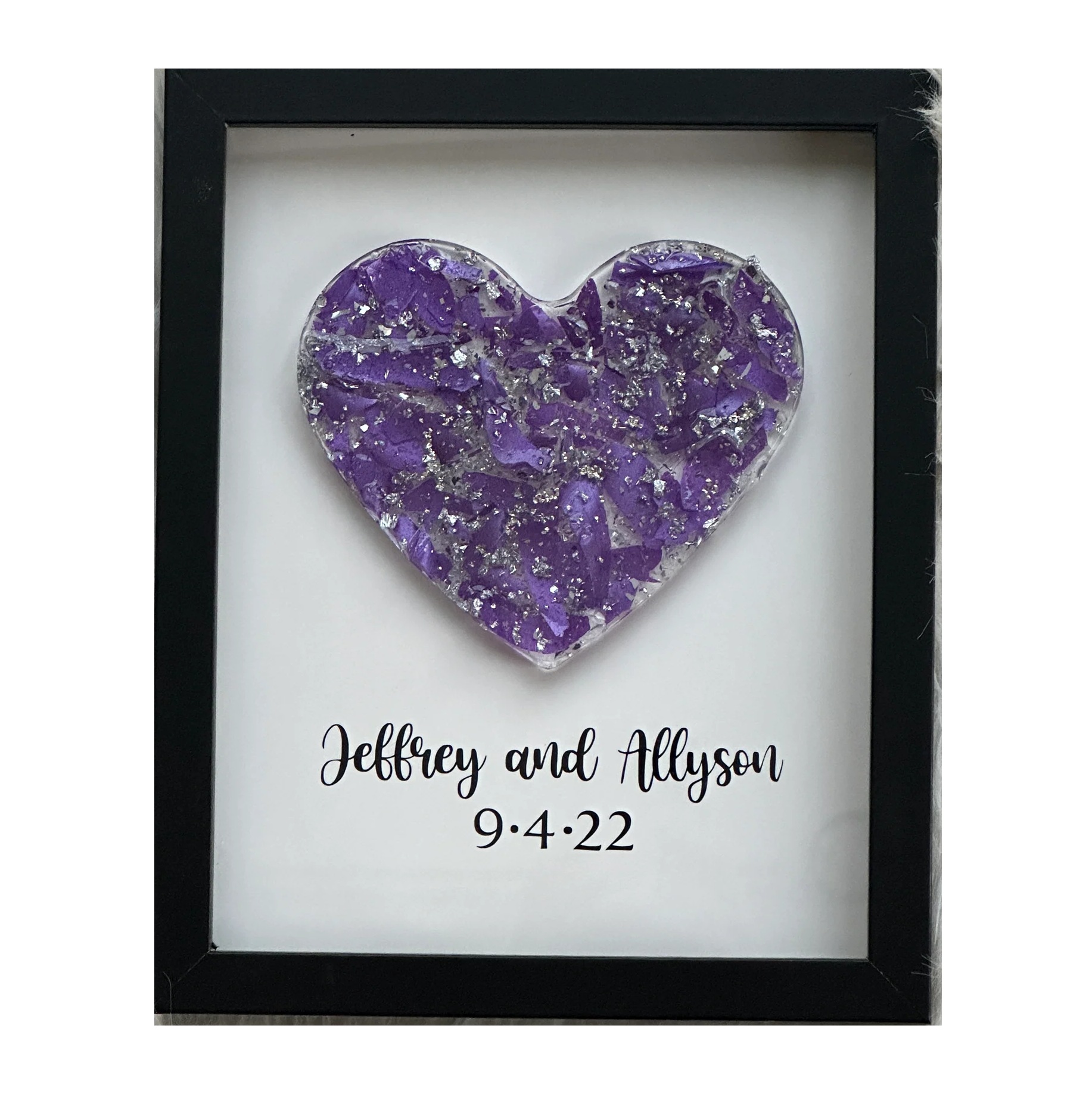 Randee, the artist, will create a beautiful heart from you groom’s smashed glass. Each piece is one of a kind. She can add gold or silver foil or any other colors of glass you request. Frame size is 8×10, your choice of black or white. Your art can be personalized with names and date or any message.