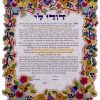 This charming ketubah is part of a series of lace, ribbon and crochet collage prints. The flowering vine border and soft, mottled background is warm and cozy. The Hebrew words, “Dodi Li,” (I am my beloved’s) tops the text. Wherever it is displayed will be ‘Home Sweet Home!’