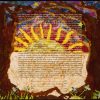 Four doves traverse a kaleidoscope of colors that encompass night and day, sunset and sunrise– eternal time. The text ascends a vertical ladder from earth to heaven. Wine and candles represent the never-ending, sacred moment of welcoming the Sabbath bride. The Hebrew word Chai (Life) reminds you that Judaism is a tradition with eyes on heaven but feet grounded in life on earth.