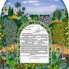 In The Four Seasons Ketubah, one is invited into a ‘Sukkat Shalom’, a Shelter of Peace, where the grapevine alludes to the day when “every man shall sit under his vine and fig tree” and “they shall beat their swords into plowshares”, as our Prophets say. Around this sukkah are trees in full bloom side by side with trees in fall leaves and in full fruit of both summer and winter. These trees represent the cycle of time and the flow of the seasons, in which the marriage, the home and the family stand steadfast, surrounded by the joy and beauty of Nature. The apple tree suggests a “taste of the Garden of Eden” and the Seven Species of Israel bring blessings of abundance and richness. The water suggests the flow of life, and its renewal, and the fish — fruitfulness. Here, too, Jerusalem looms in the distance and the two doves, along with the olive trees, the fig trees and the vines suggest Peace and Love.