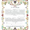 The border of flowers, fruit, Hamsa and more in this ketubah symbolize the blessing of prosperity, love and long life together