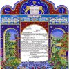 In this Ketubah there is a representation of a home with symbols of the Jewish heritage, open to nature and its richness, to Jerusalem on the right side (“If I forget thee O Jerusalem, let my right hand forget her cunning”, Psalms, 137, 5) and to the world in general, on the left side. As in most of my Ketubot, here too the seven species of Israel symbolize the blessing of abundance and richness to the couple, and a few pairs of birds represent the building of a nest, a home. At the center of the “roof” there is an image that has been embroidered on the velvet cover of the ark in synagogues throughout our history, with the tablets of the Ten Commandments, the lions of Judah, the crown of the Torah, and pomegranates, which were embroidered on the robe of Aaron, the Cohen.