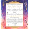 This piece conveys the magic of a night sky that is illuminated by shooting stars. Ribbons of color weave their way throughout the soft watercolor backdrop. “I am my beloved’s My beloved is mine,” is in the upper and lower arches of the design in both Hebrew and English. This ketubah fits a standard size frame.