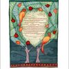 Rachel Deitsch has created this lovely ketubah. Two separate trunks growing together shelter 2 songbirds, pomegranates, a traditional fertility symbol, and lotus blossoms.