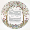 Two trees, dramatically embossed in gold, gracefully create a circle framing the text. Suggestive of bride and groom, as well as symbolizing Torah, the tree of life, these trees create a stunning chuppah and gateway amidst a blossoming garden.